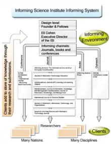 Informing science is a transdiscipline that was established to promote the study of informing processes across a diverse set of academic disciplines, including management information systems, education, business, instructional technology, computer science, communications, psychology, philosophy, library science, information science and many others. Its principal unit of analysis is the informing system, a collection of informers, clients, and channels that has been designed or has evolved to serve a particular informing need. The organization created to advance the informing science transdiscipline is the Informing Science Institute (ISI), whose founder, Eli Cohen, proposed the need for the field in his article "Reconceptualizing Information Systems as a Field of the Transdiscipline Informing Science: From Ugly Duckling to Swan" (Cohen, 1999). The ISI presently hosts an annual conference (Informing Science & Information Technology Education (InSITE)), publishes thirteen academic journals, and—through its Informing Science Press—has published dozens of books. Both its journals and books are open access at no cost online, as well as being available for purchase in print form.