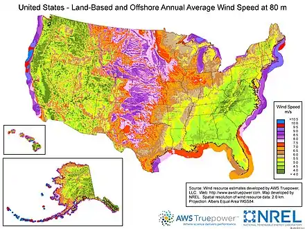 - "New Wind Resource Maps and Wind Potential Estimates for the United States". WINDExchange, DOE. February 19, 2010. Retrieved January 24, 2017.