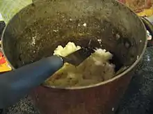 Mashed potatoes can be reconstituted from potato flour, but the process is made more difficult by lumping; a key characteristic of instant mashed potatoes is that it is in the form of flakes or granules, eliminating the chunkiness. Analogous to instant mashed potatoes are instant poi made from taro and instant fufu made from yams or yam substitutes including cereals. Poha, an instant rice mush, is also much in the same spirit, as more broadly are other instant porridges, formed from flakes, granules, or pearls to avoid lumping. Brands include Smash and Idahoan Foods.