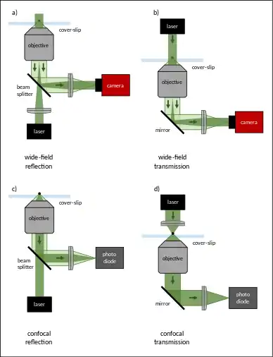 In general, the reference beam can take a different path than the scattered light within the optical setup, as long as they are coherent and interfere on the detector. However, the technique becomes simpler and more stable if both beams share the same optical path. Therefore, the reflected light off the cover-slip or the transmitted beam through the sample is typically used as the reference. For the interference to occur, it is necessary that both light waves (scattered light and reference light) are coherent. Interestingly, a light source with a large coherence length on the order of meters or more (like in modern narrow-band laser systems) is typically not needed. In the most common iSCAT realization schemes where the reflected light of a cover-slip is used as a reference and the scattering particle is not more than a few hundreds of nanometers above the glass, even “incoherent” light, e.g. from LED’s, can be used.[9]