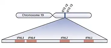 Genes encoding this group of interferons are all located on the long arm of chromosome 19 in human, specifically in region between 19q13.12 and 19q13.13. IFNL1 gene, encoding IL-29, is located downstream of IFNL2, encoding IL-28A. IFNL3, encoding IL28B, is located downstream of IFNL4.[4][5]