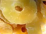 Osmotic dehydration is the process of soaking food in highly concentrated solutions of humectant. Salt and sugar are commonly used humectants for this process. Water diffusion from the food to the humectant solution is caused by osmotic pressure. The water is replaced by the humectant, which results in a lowered water activity for the food product.[3] Osmotic dehydration process results in two way mass transfer in regards to the moisture lost and the solids gained, with moisture loss being much greater than the addition of solids.[6] Advantages of osmotic dehydration include low processing temperatures, short drying times, and 20-30% lower energy consumption than typical dehydration processes.[6] Sugar is used as the humectant for candied intermediate moisture fruits, and salt is used for intermediate moisture vegetables and fish.[3] Additionally, a mixture of humectants can be formulated to manipulate the sensory properties of the food product.[2] Osmotic drying using a humectant results in a soft texture in the final product.[2]