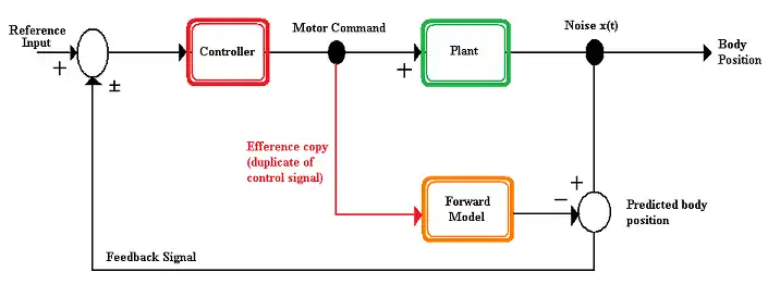 The motor command input to the forward model can be an efference copy, as seen in Figure 1. The output from that forward model, the predicted position of the body, is then compared with the actual position of the body. The actual and predicted position of the body may differ due to noise introduced into the system by either internal (e.g. body sensors are not perfect, sensory noise) or external (e.g. unpredictable forces from outside the body) sources. If the actual and predicted body positions differ, the difference can be fed back as an input into the entire system again so that an adjusted set of motor commands can be formed to create a more accurate movement.