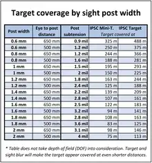 Low-power scope sights with a variable magnification starting at 1x are popular, with magnifications of 1–6x or 1–8x and daytime bright illuminated reticles are the most popular. Usually, only the center of the reticle is illuminated. Some reticles have milliradian-based wind holds or holdover marks to compensate for wind and bullet drop on long-range targets, while others prefer reticles with a simple dot and crosshair and choose to dial long-range adjustments on the turrets instead.[19] Turrets are often exposed and lockable, having ballistic drop compensation (BDC) and a zero stop, while some competitors choose to use capped turrets for the wind adjustment. Important optical characteristics[20] are true 1x or 1.1x low-end magnification, while on higher magnification it is important with a large field of view and a large exit pupil. Some other important scope qualities are weight and stray light performance.