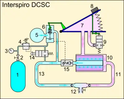 The Interspiro DCSC is the only rebreather using this gas mixture control principle that has been marketed. The principle of operation is to add a mass of oxygen that is proportional to the volume of each breath. This approach is based on the assumption that the volumetric breathing rate of a diver is directly proportional to metabolic oxygen consumption, which experimental evidence indicates is close enough to work.[1] The fresh gas addition is made by controlling the pressure in a dosage chamber proportional to the counterlung bellows volume. The dosage chamber is filled with fresh gas to a pressure proportional to bellows volume, with the highest pressure when the bellows is in the empty position. When the bellows fills during exhalation, the gas is released from the dosage chamber into the breathing circuit, proportional to the volume in the bellows during exhalation, and is fully released when the bellows is full. Excess gas is dumped to the environment through the overpressure valve after the bellows is full.[1]