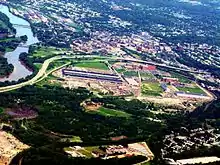 Not far from the GE plant is downtown Schenectady, which the now six-lane I-890 largely bypasses to the south and west on an elevated highway passing over a mostly industrial section of the city. The section closest to the city center runs past by the campus of Schenectady County Community College and provides panoramic views of downtown Schenectady. I-890 heads south from downtown, crossing over the Delaware and Hudson Railway and CSX's Hudson Subdivision before finally connecting to downtown by way of Broadway at exit 5. Past Broadway, the elevated highway comes to an end as I-890 heads southeastward into a dense residential area on a plateau overlooking the city. The homes are not visible from I-890, however, as the freeway is lined on both sides by a thick line of trees serving as noise barriers.[5]