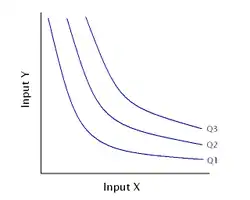 An isoquant (derived from quantity and the Greek word iso, meaning equal), in microeconomics, is a contour line drawn through the set of points at which the same quantity of output is produced while changing the quantities of two or more inputs.[1][2] While an indifference curve mapping helps to solve the utility-maximizing problem of consumers, the isoquant mapping deals with the cost-minimization problem of producers. Isoquants are typically drawn along with isocost curves in capital-labor graphs, showing the technological tradeoff between capital and labor in the production function, and the decreasing marginal returns of both inputs. Adding one input while holding the other constant eventually leads to decreasing marginal output, and this is reflected in the shape of the isoquant. A family of isoquants can be represented by an isoquant map, a graph combining a number of isoquants, each representing a different quantity of output. Isoquants are also called equal product curves.