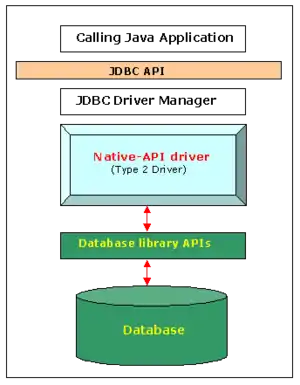 The JDBC type 2 driver, also known as the Native-API driver, is a database driver implementation that uses the client-side libraries of the database. The driver converts JDBC method calls into native calls of the database API. For example: Oracle OCI driver is a type 2 driver.
