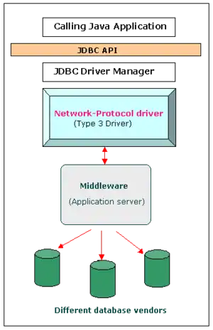 The JDBC type 3 driver, also known as the Pure Java driver for database middleware,[7] is a database driver implementation which makes use of a middle tier between the calling program and the database. The middle-tier (application server) converts JDBC calls directly or indirectly into a vendor-specific database protocol.