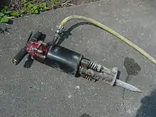 A pneumatic jackhammer, also known as a pneumatic drill or pneumatic hammer,[18] is a jackhammer that uses compressed air as the power source. The air supply usually comes from a portable air compressor driven by a diesel engine. Reciprocating compressors were formerly used. The unit comprised a reciprocating compressor driven, through a centrifugal clutch, by a diesel engine. The engine's governor provided only two speeds: