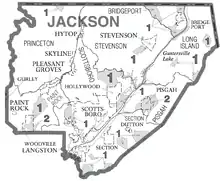 Jackson County is the northeasternmost county in the U.S. state of Alabama. As of the 2010 census, the population was 53,227.[1] The county seat is Scottsboro.[2] The county was named for Andrew Jackson, general in the United States Army and afterward President of the United States of America.[3] Jackson County is a prohibition or dry county, but three cities within the county (Bridgeport, Scottsboro, and Stevenson) are "wet", allowing alcohol sales. Jackson County comprises the Scottsboro, AL Micropolitan Statistical Area. This is included in the Chattanooga-Cleveland-Dalton, TN-GA-AL Combined Statistical Area. It is the site of Russell Cave National Monument, an archeological site with evidence of 8,000 years of human occupation in the Southeast.