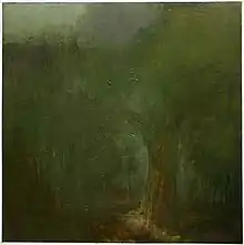 During the course of his career critics had pointed to an increasing emotional impact in his paintings and one or two of them had said that while the paintings could be comprehended entirely on their own merits, it was possible to see in them Berthot's responses to the personal difficulties he encountered over the years of his career.[9][note 5] While he was undergoing treatment for leukemia during the last few years of his life, Berthot produced paintings that have been seen to possess a high level of emotional content.[6] Writing in 2015, a friend of his, the artist Elisa Jensen, referred to them as "haunting, haunted, living, breathing, and absolutely undeniably alive."[1][note 6] Concerning one of them, called "Night, Wood, and Rock," a friend said it was "pure essence, stripped of all inessentials," and that his close observation of it infused him with a "serene acceptance of life's glory, suspended always above death, no matter death's imminence or seeming finality."[18]