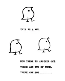 - This is a WUG. Now there is another one. There are two of them. There are two ________.[15]