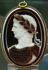 The Greeks started using gold and gems in jewellery in 1600 BC, although beads shaped as shells and animals were produced widely in earlier times. Around 1500 BC, the main techniques of working gold in Greece included casting, twisting bars, and making wire.[30] Many of these sophisticated techniques were popular in the Mycenaean period, but unfortunately this skill was lost at the end of the Bronze Age. The forms and shapes of jewellery in ancient Greece such as the armring (13th century BC), brooch (10th century BC) and pins (7th century BC), have varied widely since the Bronze Age as well. Other forms of jewellery include wreaths, earrings, necklace and bracelets. A good example of the high quality that gold working techniques could achieve in Greece is the ‘Gold Olive Wreath’ (4th century BC), which is modeled on the type of wreath given as a prize for winners in athletic competitions like the Olympic Games. Jewellery dating from 600 to 475 BC is not well represented in the archaeological record, but after the Persian wars the quantity of jewellery again became more plentiful.[31] One particularly popular type of design at this time was a bracelet decorated with snake and animal-heads Because these bracelets used considerably more metal, many examples were made from bronze. By 300 BC, the Greeks had mastered making coloured jewellery and using amethysts, pearl, and emeralds. Also, the first signs of cameos appeared, with the Greeks creating them from Indian Sardonyx, a striped brown pink and cream agate stone. Greek jewellery was often simpler than in other cultures, with simple designs and workmanship. However, as time progressed, the designs grew in complexity and different materials were soon used.