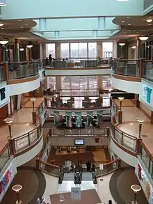 The six-story student center contains a large food court (West 82), a fine dining restaurant (Latitude 39), a ballroom, student shop (Bobcat Depot), coffee shop (The Front Room), theater, many study areas, several computer labs, administrative offices, and other amenities connected by three sets of escalators.