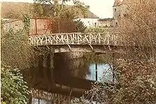 In 1873 Monier applied for an addition to patent 77165 to cover bridges, and in 1875 built his first bridge for the marquis de Tillière. It spans 14 metres across the moat of the chateau. The girders are integral with the slab, and the guard rails are in the rustic style, imitating wood, a decorative technique described today by the term: faux bois (French for "false wood").