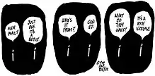 Feiffer had no stories to tell. His main concern was to explore character. In a series of a dozen or so pictures, he would show the shifts of mood that flickered across the faces of men and women as they tried, often vainly, to explain themselves to the world, to their husbands and wives, to their mistresses and lovers, to their employers, to their rulers, or simply to the unseen adversaries at the other end of the telephone wires ... It would be no exaggeration to say that his dialog is as acute as any that is being written America today. Dialog aimed at sophisticated minds, usually with the purpose of shaking them out of sophistication into real awareness.[10]