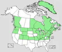 Juncus gerardii is mainly a coastal species, occurring at the high tide mark on the Mediterranean, Atlantic, Baltic and Black sea shorelines of Europe and the east coast of North America [1] Juncus gerardii is one of the many species identified by Eric Hultén as amphi-Atlantic plants, meaning that they have a disjunct distribution on both sides of the Atlantic, but are absent on the Pacific side of the globe.[2]:172 It also occurs inland in parts of eastern Europe, west and central Asia, particularly on saline soils. In N. America it occurs along the shorelines of areas once flooded by the sea, and as a weed along railway lines, for example in Minnesota.[2] In Indiana, it is the only Juncus species found in the Tipton Till Plain, a Till Plain in the Glacial till plains.[3]