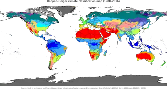 - Beck, Hylke E.; Zimmermann, Niklaus E.; McVicar, Tim R.; Vergopolan, Noemi; Berg, Alexis; Wood, Eric F. (30 October 2018). "Present and future Köppen-Geiger climate classification maps at 1-km resolution". Scientific Data. 5: 180214. Bibcode:2018NatSD...580214B. doi:10.1038/sdata.2018.214. ISSN 2052-4463. PMC 6207062. PMID 30375988.