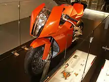 The KTM 1190 RC8 was a sport bike made by KTM.[1] The first generation 2008 model had a 1,148 cc (70.1 cu in) V-twin engine and was the Austrian manufacturer's first-ever Superbike design. The RC8 model was supplemented with RC8 R models one year later in 2009 and the RC8 designation had its last year of production in 2010. Current models from 2009 through 2013 use a 1,195 cc (72.9 cu in) V-twin engine with a twin spark per cylinder technology [2] design debuting on the 2011 model.