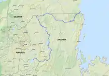 The Kagera rises in Burundi and flows into Lake Victoria. It is the largest single inflow into the lake, contributing approximately 6.4 billion cubic metres of water a year (about 28 per cent of the lake's outflow).[3] The Kagera is formed by the confluence of the Ruvuvu and the Nyabarongo, close to the northernmost point of Lake Tanganyika.[4] It forms parts of the Burundi–Tanzania, Rwanda–Tanzania, Burundi–Rwanda, and Tanzania–Uganda borders. It lends its name to Akagera National Park in northern Rwanda, as well as to the Kagera Region of Tanzania. On the river are the Rusumo Falls, an important crossing point between Rwanda and Tanzania. It is near the town of Rusumo.