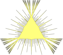 To construct an even smaller set, subdivide your triangle into, say, 2n triangles each of base length 2−n, and perform the same operations as we did before when we divided our triangle twice and eight times. If both the amount of overlap we do on each triangle and the number n of the subdivision of our triangle are large enough, we can form a tree of area as small as we like. A Besicovitch set can be created by combining three rotations of a Perron tree created from an equilateral triangle.