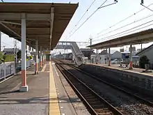 This station consists of two opposed side platforms serving two tracks, connected to the station building by a footbridge.