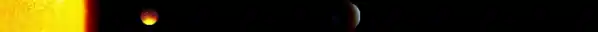 Kepler-10 is a G-type star, like the Sun. With a mass of 0.895 (± 0.06) Msun and a radius of 1.056 (± 0.021) Rsun, the star is approximately 10% smaller than and 5% wider than the Sun. The metallicity of Kepler-10, as measured in [Fe/H] (the amount of iron in the star), is -0.15 (± 0.04); this means that Kepler-10 is about 70% as metal-rich as the Sun. Metallicity tends to play a large role in the formation of planets, determining if they form, and what kind of planet they will form.[12] In addition, Kepler-10 is estimated to be 11.9 billion years old and to have an effective temperature of 5627 (± 44) K;[3] To compare, the Sun is younger and hotter, with an age of 4.6 billion years[13] and an effective temperature of 5778 K.[14]