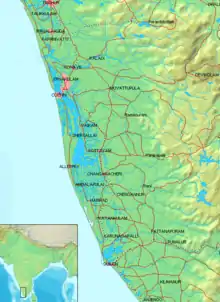 The Kerala backwaters are a network of brackish lagoons and lakes lying parallel to the Arabian Sea coast (known as the Malabar Coast) of Kerala state in southern India, as well as interconnected canals, rivers, and inlets, a labyrinthine system formed by more than 900 kilometres (560 mi) of waterways, and sometimes compared to American bayous.[3] The network includes five large lakes linked by canals, both man made and natural, fed by 38 rivers, and extending virtually half the length of Kerala state. The backwaters were formed by the action of waves and shore currents creating low barrier islands across the mouths of the many rivers flowing down from the Western Ghats range. In the midst of this landscape there are a number of towns and cities, which serve as the starting and end points of backwater cruises.[4]