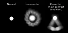 The classic symptom of keratoconus is the perception of multiple "ghost" images, known as monocular polyopia. This effect is most clearly seen with a high contrast field, such as a point of light on a dark background. Instead of seeing just one point, a person with keratoconus sees many images of the point, spread out in a chaotic pattern. This pattern does not typically change from day to day, but over time, it often takes on new forms. People also commonly notice streaking and flaring distortion around light sources. Some even notice the images moving relative to one another in time with their heart beat. The predominant optical aberration of the eye in keratoconus is coma.[11][12] The visual distortion experienced by the person comes from two sources, one being the irregular deformation of the surface of the cornea, and the other being scarring that occurs on its exposed highpoints. These factors act to form regions on the cornea that map an image to different locations on the retina. The effect can worsen in low light conditions, as the dark-adapted pupil dilates to expose more of the irregular surface of the cornea.