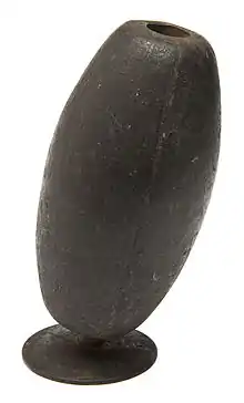 The grenades have the appearance of a cast-iron ball, or a skinny dart, having fins of cardboard to stabilize the flight. They assured landing on the nose, which was backed by a percussion cap that set off the main powder charge in the body. The grenades were largely inefficient because they had to land on their nose to detonate. In one incident Confederates caught them in blankets and hurled them back at the attackers.[1]