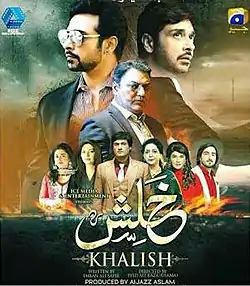 Khalish is a 2018 Pakistani drama serial directed by Syed Ali Raza Usama, produced by Aijaz Aslam, and written by Imran Ali Safir.[1] The drama stars Faisal Qureshi, Asif Raza Mir and Sunita Marshall as the main leads. The serial premiered on 14 February 2018 until 19 August on Geo Entertainment.[2] It first aired every Wednesday, then Saturday and finally Sunday at 8:00pm .[3]