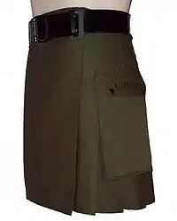 A kilt covers the body from the waist down to the centre of the knees. The overlapping layers in front are called "aprons" and are flat; the single layer of fabric around the sides and back is pleated. A kilt pin is fastened to the front apron on the free corner (but is not passed through the layer below, as its function is to add weight). Underwear may or may not be worn, as the wearer prefers, although tradition has it that a "true Scotsman" should wear nothing under his kilt.[8][9] The Scottish Tartans Authority, however, warns that in some circumstances the practice could be "childish and unhygienic" and flying "in the face of decency".[10]