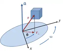 - The angular velocity is represented in Figure 1 by a vector Ω pointing along the axis of rotation with magnitude ω and sense determined by the direction of rotation as given by the right-hand rule.