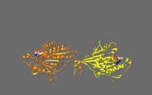 ![]() Crystallographic structure of the human kinesin motor domain depicted as a rainbow colored cartoon (N-terminus = blue, C-terminus = red) complexed with ADP (stick diagram, carbon = white, oxygen = red, nitrogen = blue, phosphorus = orange) and a magnesium ion (grey sphere).[14] | |||||||||
