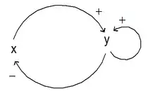 Consider an example of two elements in figure E. Using a software, this graph of interactions is drawn as shown in figure F. There are two thresholds assigned to element y: Ѳ12, concerning its interaction with x and Ѳ22, concerning its interaction with itself. The variable y and function Y have three possible values: 0, 1, and 2. Element x have a single threshold, Ѳ21, because of the interaction x to +y, so the variable x and function X will be two-valued.