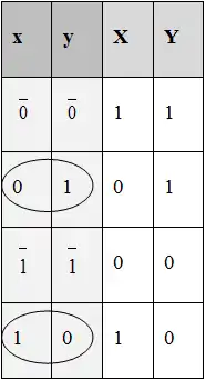 The state table of graph of interactions in figure D is shown in figure G. This table states for each state of the variables (x, y) i.e. present or absent, which products are synthesized and which are not synthesized at a significant rate. Consider the state 00/10, in which both of the gene products are absent but gene X is on. As product x is absent but being synthesized so it can be expected that in near future it will be present and the logical value of x will change from 0 to 1. This can be described by the notation Ō, in which the dash above the digit is due to the fact that variable x is committed to change its value from 0 to 1. Generally, a dash over the figure representing the logical value of a variable each time this value is different from that of the corresponding function. The state just considered can thus be represented as ŌO.