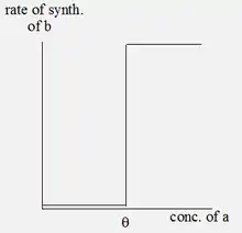 There is little effect of a, until it reaches a threshold concentration theta, and at higher concentrations a plateau is reached which shows the maximal rate of synthesis of b. Such a nonlinear, bounded curve is called a sigmoid. It can be suggested that a is "absent" for a < theta and "present" for a > theta. The sigmoid curve can be approximated by the step function, as in figure C.
