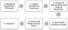 The first approach for qualitative modeling was based on extreme discretization since all genes could be either on (present) or off (absent).[6] This Boolean approach was generalized into a multi-valued approach i.e. Kinetic Logic,[7][8] in which logical identification of all steady states became possible.[9]
