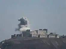 During the Syrian Civil War that began in 2011, UNESCO voiced concerns that the war might lead to the damage of important cultural sites such as Krak des Chevaliers.[50] It has been reported that the castle was shelled in August 2012 by the Syrian Arab Army, and the Crusader chapel has been damaged.[51] The castle was reported to have been damaged in July 2013 by an airstrike during the Siege of Homs,[52] and once more on 18 August 2013 it was clearly again damaged yet the amount of destruction is unknown. The Syrian Arab Army recaptured the castle and the village of al-Hosn from rebel forces on March 20, 2014. Since then, both the UNESCO and the Syrian government have produced periodic reports about the state of the site, required reconstruction and conservation measures, and advance in these.[53]