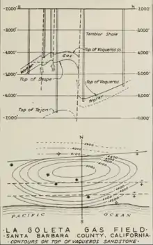 The gas field is within an anticlinal structure cut and bounded on the north by the More Ranch Fault.[8][9] The geologic unit on the surface is the Monterey Formation.[10] Beneath the Monterey is the Rincon Formation, a shale unit which forms an impermeable cap on the gas reservoir below. The main productive zone, directly under the Rincon, is in the Vaqueros Formation, a sandstone unit found about 4,000 feet below ground surface, familiar from its outcrops on the lower slopes of the Santa Ynez Mountains, right at the line where chaparral replaces grassland. Below the Vaqueros is either the red sandstone and conglomerate Sespe Formation, which was found to contain pockets of gas, none of commercially producible quantity in the early history of the field,[11] or the "Eocene-age" unit, as it is known in the 2013 Environmental Impact Report. This is the unit being targeted by drilling in the 2014 field enhancement project.[12]