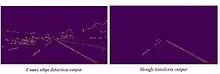 The lane detection system used by the lane departure warning system uses image processing techniques to detect lane lines from real-time camera images fed from cameras mounted on the automobile. Examples of image processing techniques used include the Hough transform, Canny edge detector, Gabor filter and deep learning. A basic flowchart of how a lane detection algorithm works to produce lane departure warning is shown in the figures.