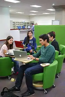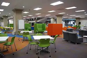 Learning commons, also known as scholars' commons, information commons or digital commons, are learning spaces, similar to libraries and classrooms that share space for information technology, remote or online education, tutoring, collaboration, content creation, meetings, socialization, playing games and studying.[1][2] Learning commons are increasingly popular in academic and research libraries, and some public and school libraries have now adopted the model.[3] Architecture, furnishings and physical organization are particularly important to the character of a learning commons, as spaces are often designed to be rearranged by users according to their needs.[4]