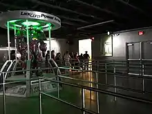 The entrance to the ride is themed to the Lexcorp headquarters, the lair of Lex Luthor. Inside there are posters advertising Luthor’s different corporations such as LexAir, LexPower, Lexcom, and Lexcorp. One wall features blueprints for Lexcorp weapons. One wall features a picture of Lex and the company goal. At the far end is a fake elevator and Lex Luthor’s Power suit, his weapon for fighting Superman. From time to time Lex can be heard welcoming guests and thanking them for volunteering to test his newest project. These recordings often feature ominous sayings to tell the guests that something is wrong. Guests then move through secure access and pass company mottos and offices to reach the loading area.