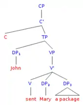 Richard Kayne proposed the idea of unambiguous paths as an alternative to c-commanding relationships, which is the type of structure seen in examples (8). The idea of unambiguous paths stated that an antecedent and an anaphor should be connected via an unambiguous path. This means that the line connecting an antecedent and an anaphor cannot be broken by another argument.[28] When applied to ditransitive verbs, this hypothesis introduces the structure in diagram (8a). In this tree structure it can be seen that the same path can be traced from either DP to the verb. Tree diagram (7b) illustrates this structure with an example from English. This analysis was a step toward binary branching trees, which was a theoretical change that was furthered by Larson's VP-shell analysis.[29]