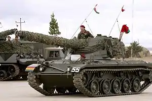 Some light tanks, such as the M551 Sheridan armored reconnaissance vehicle, could be rigged for low-velocity airdrops from cargo aircraft.[8] With this method the tank is pulled out of the aircraft by brake chutes and skids to a stop. The crew does not ride in the tank during extraction, but parachutes from another plane. Upon landing, they go to their tank, release the lines, and drive it away.