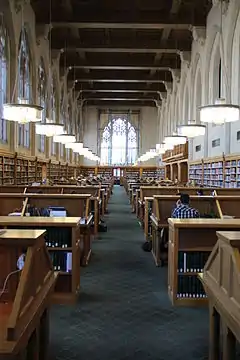 The library is contained within five stories on the eastern wing of the Sterling Law Building, completed in 1931 and designed by James Gamble Rodgers. The library's main reading room, named for the Class of 1964, is located on the library's third story. Employing the Collegiate Gothic style used throughout the law school campus, it is modeled after the King's College Chapel at the University of Cambridge.[5]