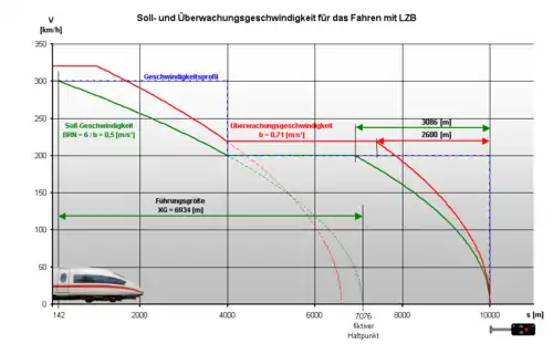Deceleration rates are more conservative with LZB than with conventional German signalling. A typical passenger train braking curve might have a "permitted speed" deceleration of 0.5 m/s2 (1.6 ft/s2) and a "monitoring speed" deceleration of 0.71 m/s2 (2.3 ft/s2) 42% higher than the deceleration for the permitted speed, but lower than the 0.76 m/s2 (2.5 ft/s2) required to stop from 140 km/h (87 mph) in 1,000 m (3,281 ft) used in conventional signaling. The ICE3, which has a full service braking deceleration of 1.1 m/s2 (3.6 ft/s2) below 160 km/h (99 mph), dropping to 0.65 m/s2 (2.1 ft/s2) by 300 km/h (190 mph), has a LZB target speed deceleration of only 0.68 m/s2 (2.2 ft/s2) to 120 km/h (75 mph), 0.55 m/s2 (1.8 ft/s2) between 120 and 170 km/h (75 and 106 mph), and 0.5 m/s2 (1.6 ft/s2) at higher speeds.[8]