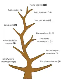 Histone H1 differs strongly from the core histones. Rather than originating from archaeal histones, it probably evolved from a bacterial protein.[6] Unlike core histones featuring a so-called histone fold, H1s typically have a short basic N-terminal domain, a globular domain and a lysine-rich C-terminal domain (the N- and C-termini are also referred to as tails).[7] H1s are also less conserved than the core histones. The mammalian H1 isoforms are paralogs, which means their encoding genes originated from gene duplication events. The corresponding H1 variants in two different species, such as human and mouse H1.4 are orthologs – they had a common ancestor gene and were separated by speciation. Within one species, the paralogous H1 variants show a high conservation of the globular core domain, while the N- and C-termini are more divergent. At the same time H1 orthologs among mammals are highly conserved across the whole protein sequence, for example human and mouse H1.4 share 93.6% sequence identity.[2]
