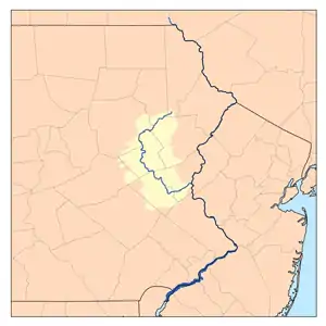The watershed of the Delaware River drains an area of 14,119 square miles (36,570 km2) and encompasses 42 counties and 838 municipalities in five U.S. states—New York, New Jersey, Pennsylvania, Maryland, and Delaware.[1]:p.9 This total area constitutes approximately 0.4% of the land mass in the United States.[1]:p.9 The Delaware River rises in New York's Catskill Mountains flowing southward for 419 miles (674 km) into Delaware Bay where its waters enter the Atlantic Ocean near Cape May in New Jersey and Cape Henlopen in Delaware. There are 216 tributary streams and creeks—an estimated 14,057 miles of streams and creeks—in the watershed.[1]:p.11,25